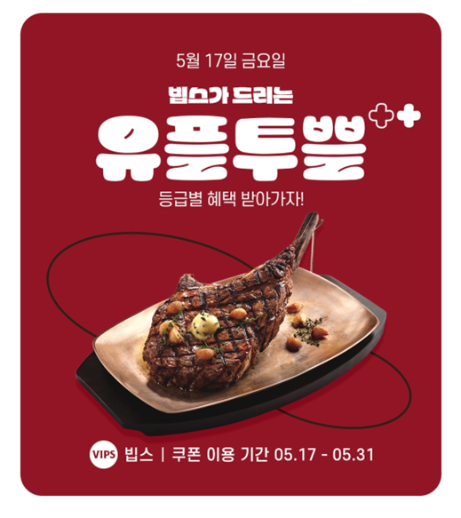 - VVIP 등급 : [VVIP초이스] 스테이크 무료(성인 2인 샐러드바 이용 시), [상시] 15% 할인