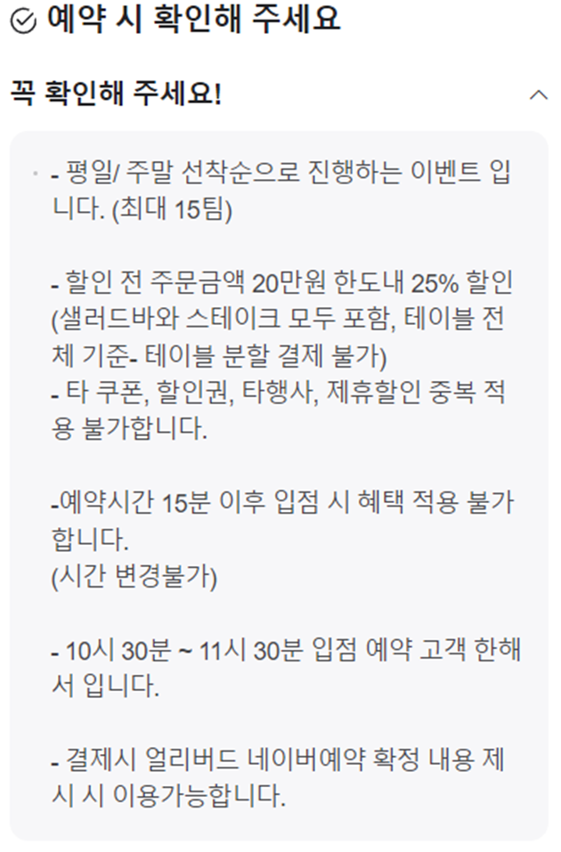 - 할인 전 주문금액 20만 원 한도 내 25% 할인(샐러드바, 스테이크 모두 포함, 테이블 분할 결제 불가)