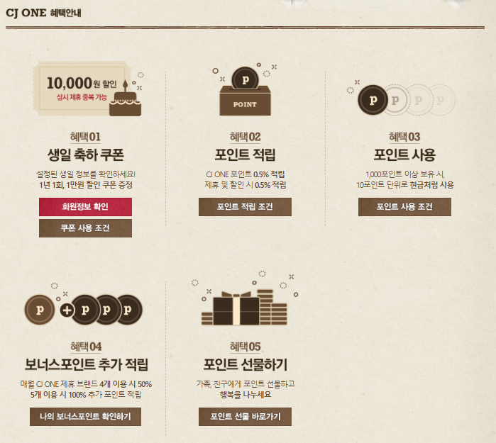 CJ ONE 멤버십을 이용하면 생일 축하 쿠폰, 포인트 적립 및 사용 등 혜택을 받을 수 있습니다.