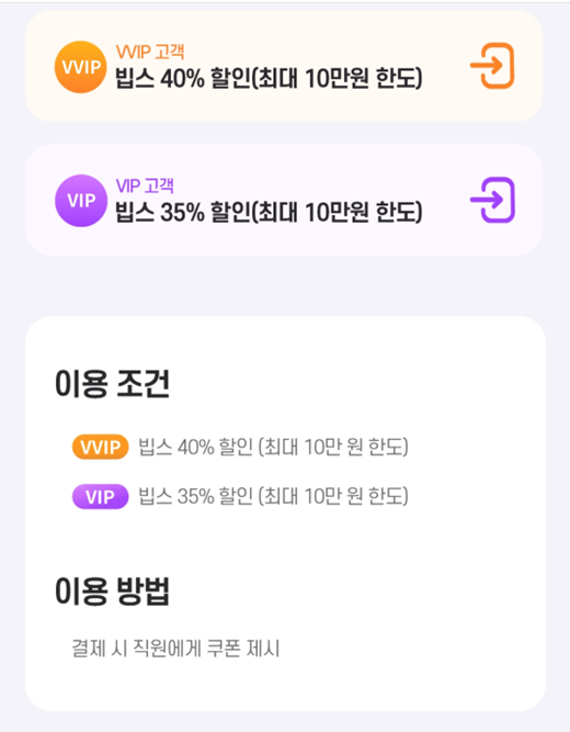 - VVIP등급 : 빕스 40% 할인(최대 10만 원 한도)